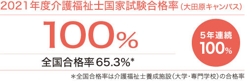 介護福祉士国家試験合格率は、2017年度から5年連続で100%を達成。就職率も毎年100%を誇り、全国の福祉施設から数多くの求人が寄せられ、全員が希望した分野に就職しています。