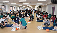 - 1年生140人全員がBLS普通救命講習を受講。心臓マッサージや人工呼吸、AED操作などを体験します。