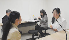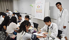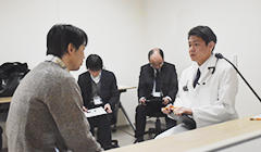 - 1年生が模擬患者さんに対し面接を行う画期的な取り組みです。模擬患者さんは地元住民の方が多く、地域と連携した授業です。