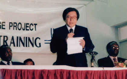 「JICAケニア医療技術教育強化プロジェクト」の中堅技術者養成研修開講式。ケニアのカルウェオ厚生大臣、ケニア国立医療訓練カレッジのボイド学長。 (1998年11月) -