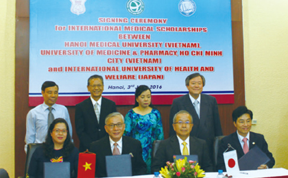 ベトナムのグエン・ティ・キム・ティエン保健大臣同席のもと、ハノイ医科大学とホーチミン市医科薬科大学と医学部留学生受け入れのための協定締結。 (2016年5月) -