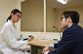 また、本学が⼒を⼊れている医療⾯接トレーニングでは、地域の皆さんに医療面接模擬患者としてご協力いただき、医師の最も重要な基本的能⼒であるコミュニケーション⼒を養います。遠からず地域で臨床実習を担当させていただくことに重きを置き、「医療面接」実習で、いろいろな病気を演じていただき、学生の患者対応能力を高めるように努めています。