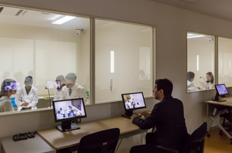 22の模擬診察室があります。模擬患者さんや、学生同士のロールプレイを通して医療面接と身体診察のトレーニングを行います。モニター室では、2台の天井カメラからの映像と音声を確認できるほか、学生自身も録画映像を見ながら振り返ることができます。この部屋は、客観的臨床能力評価試験(OSCE)にも活用されます。