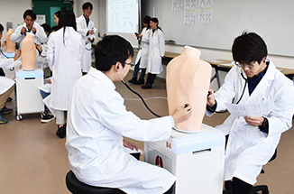 我が国における既存の医学教育の枠にとらわれることなく1年次から医療面接・身体診察の授業や基礎・臨床を統合した器官別講義などを能動的に学んでいくカリキュラムを導入しており、実践形式のシミュレーション教育はパワフルなアクティブラーニングの手法となっています。