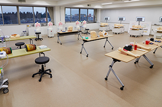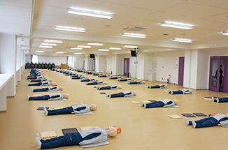 50体のシミュレーターが配置された、日本最大の一次救命処置室。1体につき3人一組で、150人が一度にCPR(心肺蘇生法)やAED(自動体外式除細動器)を用いた一次救命処置を練習することができます。地域の消防署と連携した救命講習も開催しています。