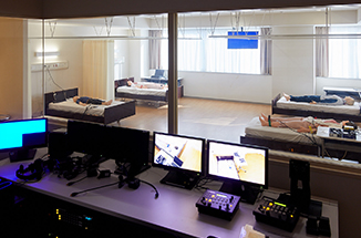 実際の病棟を模した個室と4床室があります。ここで、病棟患者の急変対応などを学びます。状況を把握し、何を優先させて初期対応をするかのトレーニングを行い、映像を見ながら振り返り、ディスカッションを通じて理解を深めていきます。