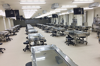 医学教育にとって最も重要な実習のひとつである解剖学実習は2年次3学期を予定しています。教員用も含めて37台の解剖台すべてが1室に完備されています。