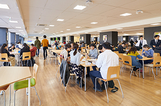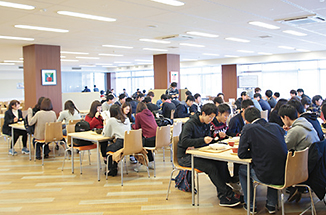 300席以上あり、テラスからの景色を楽しみながら食事ができます。学生や学科主催のイベント会場としても使われます。