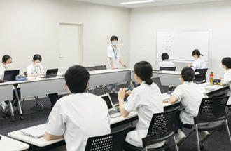 最終ステップとなる「関連職種連携実習」では、病院や福祉施設で総合サービス計画(治療やリハビリテーションなどの実施計画)の立案に関わります。病院・施設の各職種が集うカンファレンスにも参加し、本物の「チーム医療・チームケア」を体験します。チューターと施設側の医師を含む専門職が一丸となってサポートします。