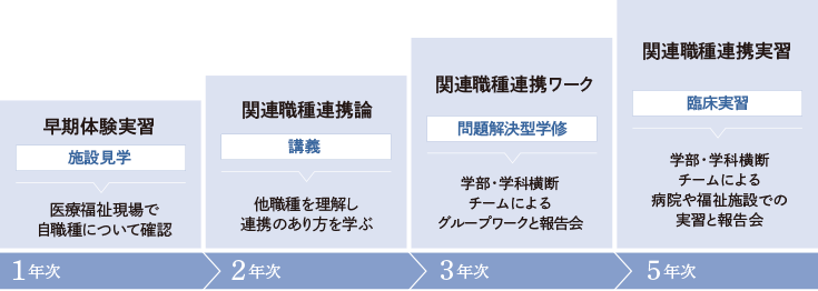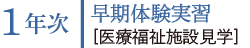 最初のステップとして、医療福祉現場で「早期体験実習」を実施します。全学生が現場を体験できるのは、6つの附属病院など豊富な関連施設を有する本学ならではのメリットです。早期に「チーム医療・チームケア」の空気に触れる経験は、学修意欲の向上や理解の促進に結びつき、学びのさまざまな場面で生かされます。
