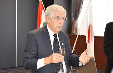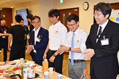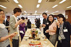 松谷有希雄副学長の挨拶、三浦総一郎大学院長の乾杯の音頭に続いて、歓談が始まりました。立食形式の会場は、普段関わりの少ない人同士がひとつのテーブルを囲むように席割を工夫しました。その甲斐あって、9つのテーブルはどこも先生方を中心に話に花を咲かせていました。