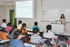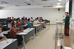 科学技術振興機構(JST)のさくらサイエンス・ハイスクールプログラムとして、5月18日、ミャンマーから高校生30名と引率の先生5名が成田キャンパスを訪問しました。約4時間という短い滞在のなかで、本学の紹介、講義、模擬授業、医学教育シミュレーションセンターの視察、そして本学のミャンマー人留学生との昼食会と盛りだくさんのプログラムを用意しました。本学は、各地を訪問する1週間のプログラムの最終行程でしたが、高校生たちは疲れた様子を見せずにプログラムに集中していました。