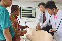 医学教育シミュレーションセンターの視察では、英語とミャンマー語で説明を聞き、実際にシミュレーション人形や聴診器に触れることができ、興味津々の様子でした。昼食会では本学の留学生に積極的に質問する様子が見受けられ、応対した留学生によると、留学に興味のある生徒が多く、将来やりたいことが見つかったという感想も聞かれたそうです。将来何をするかを決めていく大切な時期にある高校生にとって、日本での1週間が実りの多い時間になったことを祈っています。