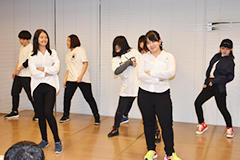 ステージでは、学科ごとに教員から新入留学生が紹介され、続いて、先輩を代表して、医学科2年のモンゴル人留学生と看護学科2年の中国人留学生が流暢な日本語での歓迎の挨拶を述べました。さらに、民族衣装と白いハンカチで優雅に踊るミャンマーの伝統舞踊、ダンス部と留学生2名のコラボレーションによるヒップホップダンスが披露されました。このヒップホップダンスは事前に数回の練習を重ねたもので、難易度の高いパフォーマンスでした。また、会の終了間際には、急遽、赤津晴子先生を中心とする教員のコーラス隊が結成され、日本の伝統曲を熱唱しました。