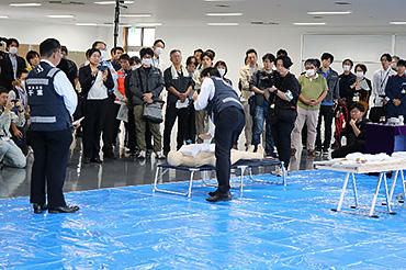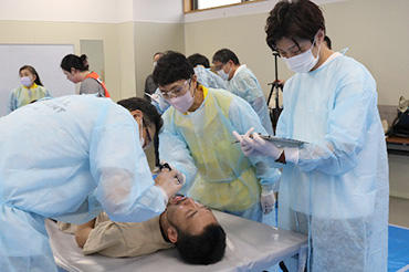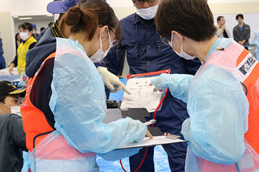 訓練は、航空機事故により多数の死亡者が発生したことを想定し、検視・検案・身元確認等の一連の流れを確認する内容で、本学医師3名は検案医として、身元確認ブースでは歯科医師1名がそれぞれの場所で警察と協力しながら訓練を実施しました。