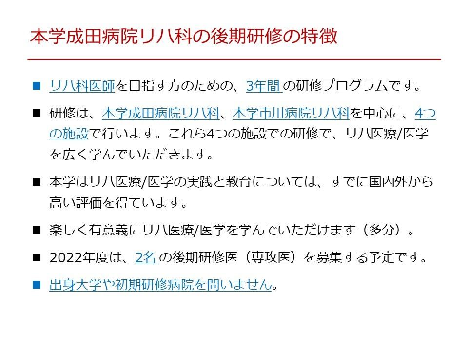 本学医学部リハ医学教室では、本学成田病院を中心とした(基幹病院とした)リハ科後期研修プログラムを立ち上げています。本学医学部リハ医学教室に興味がある方は(特に、来春に初期研修を終える方は)本ホームページ内の「医学生・研修医の方へ」→「当教室における後期研修プログラム」をぜひご覧ください。