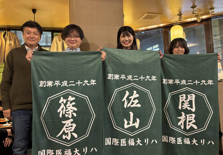 2025年4月に3人の先生方、すなわち関根希和子先生、佐山智咲先生、篠原孝幸先生が当教室に入局する(当教室の後期研修プログラムに参加する)ことが決定しました。関根先生と佐山先生は本学医学部一期生であり、篠原先生は山形大を卒業した後に本学に来てくれることとなりました。そして、少々気が早かったのですが、1月24日に3人の先生方の歓迎会を盛大に開催しました。歓迎会においては、3人の先生方に教室伝統のbig green towelが贈呈されました。3人の先生方の今後の大活躍を期待しています。