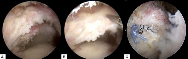 C: 特殊な糸を用いて断裂部を上腕骨に縫着した(左側に青と白黒縞模様の糸による結び目が見えている)。