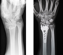 ①橈骨遠位端骨折粉砕の強い場合、関節内に骨折が及ぶ場合は手術を行います。プレートを用いた整復固定を行いますが、粉砕の強い場合は創外固定や人工骨充填を併用します。