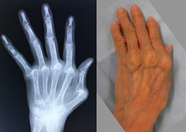 リウマチによる手・肘の変形に対する治療は一般的に難易度が高く、また習熟している施設は限られています。当院ではリウマチ手指や肘に対する人工関節手術を積極的に行い、良好な治療成績を得ています。また比較的若年の方で関節面が保たれている場合は可能な限り関節温存手術を行います。当院の担当医はリウマチ指の人工関節手術、人工肘関節手術、人工関節を用いない手指軟部組織形成術や肘関節形成術の経験も豊富です。人工関節は複数の種類がありますが、患者さんの状態に合わせて使い分けています。肩については、変形性関節症のところでも触れている、近年開発された肩の特殊な人工関節(リバース型)が導入されて以降、良好な成績が得られています。