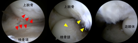 (左:前方鏡視、中:後方鏡視、右:肘関節内遊離体)
