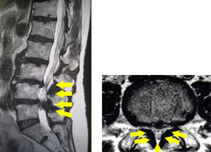 腰部脊柱管狭窄症と同様に、腰の痛みのほか、下肢(殿部、大腿部、下腿、足など)に放散する痛みやしびれ、間欠跛行、また排尿や排便に障害(膀胱直腸障害)が出たりします。