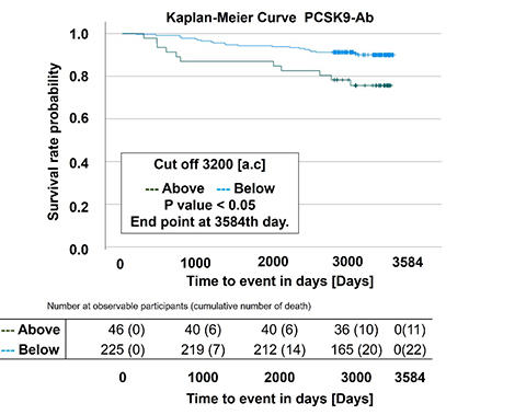 健常者110名、糖尿病患者274名で、血液中のPCSK9タンパク、抗PCSK9抗体をamplified luminescence proximity homogeneous assay-linked immunosorbent assay (AlphaLIS法)で測定しました。その結果、PCSK9タンパク、抗PCSK9抗体は健常者に比し、糖尿病患者で有意に高値でした。さらにPCSK9タンパク、抗PCSK9抗体測定後、糖尿病患者を平均観察期間4.9年(最長9.6年)追跡して調査を行いました。その結果、PCSK9抗体価3200 をカットオフ値に定め検討したところ、抗体価高値群(3200以上)の死亡リスクは低値群(3200未満)と比べodds比2.7倍上昇しました(下図)。脂質値、年齢、スタチンの有無で調整した多変量解析の結果でもPCSK9抗体価は独立した糖尿病患者の死亡リスク因子であることが明らかになりました。今後さらに症例数を集めて長期間検討する必要がありますが、PCSK9抗体価は、糖尿病患者の予後予測マーカーとして有用な可能性が示唆されました。この結果はScientific Reports誌に掲載されています。
