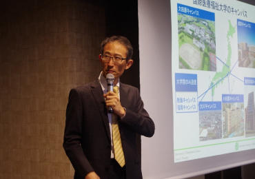 本学の薬学部設置は、大田原キャンパス(栃木県)、大川キャンパス(福岡県)に続き、成田キャンパスで3ヵ所目となります。成田薬学部の西村和洋教授(就任予定)は、「臨床に強い薬剤師」の養成に加えて、「国際性の拠点」という成田薬学部の特徴を示し、海外での研修が必修であることなどを説明しました。