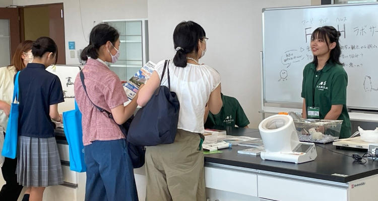 薬学部では、学科紹介やフロア見学、薬学部のサークルの紹介などを行いました。今年度入学した1期生がフロアを案内しながら、学生生活や受験のアドバイスについてお話させていただきました。