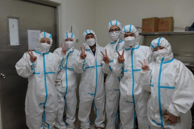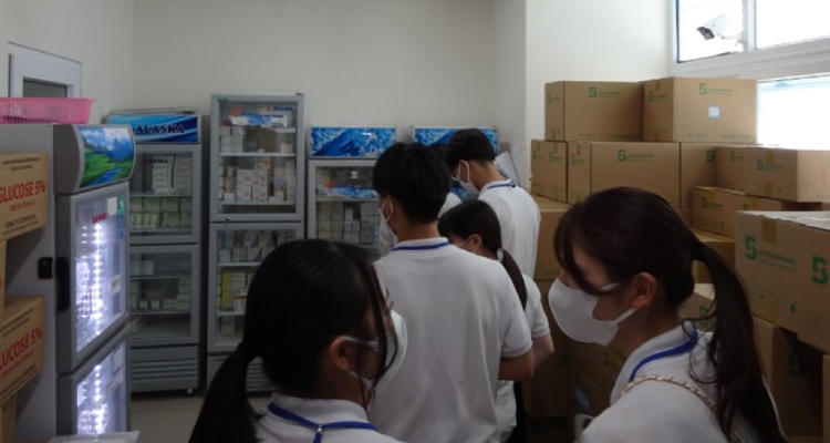 ベトナムでは国立病院で研修を実施し、薬剤部で医薬品の管理を学んだり、防護服を着用して抗がん剤の調製を見学したりしました。