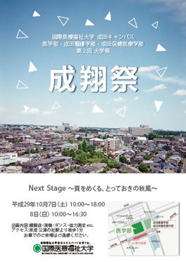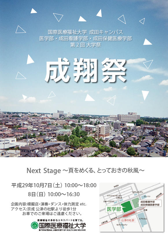 - 「成翔祭」という名称には、「空の玄関である成田から、様々な分野で翔(かけ)るように」という想いが込められています。 本年度の成翔祭は、2期生と医学部生を迎え、より一層賑やかになりました。