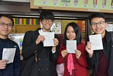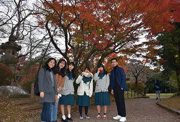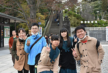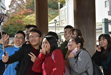 11月24日の午前中、本学の留学生別科の留学生15人と成田国際高校の生徒9人が成田山新勝寺を散策しました。10日前に来日したばかりの留学生が大半で、初めて見る新勝寺や紅葉に魅了されていました。初めはお互いに話の糸口がつかめない様子でしたが、高校生から参道の店や参拝のしかた、おみくじなどについて説明してもらいながら歩き、一緒に自撮り写真におさまっていました。覚えたての漢字や母国と違う日本の高校生の生活について打ち解けて話している様子も見られ、お互いの文化を学ぶ有意義な経験になりました。短い時間での交流でしたが、最後は名残惜しそうにしている姿も見られました。