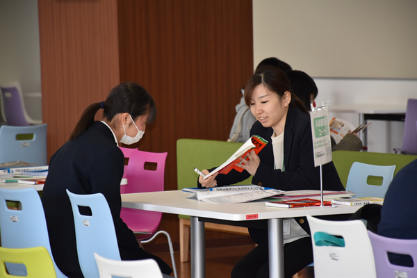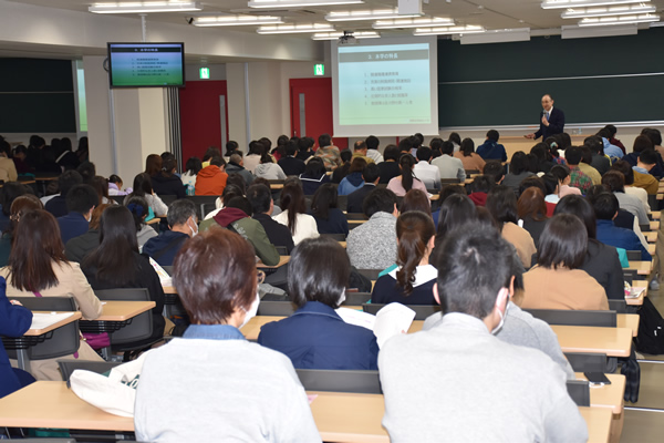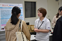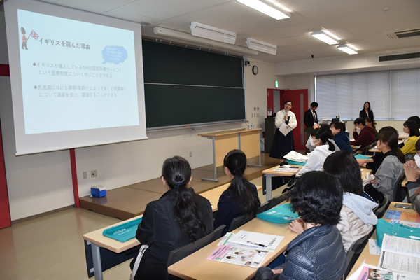 総合ガイダンスでは、本学の紹介に続いて、学生による「海外研修体験談」と「臨床実習体験談」の発表があり、成田キャンパスでの学びの様子を学生が自らの実感を通して来場者に伝えました。