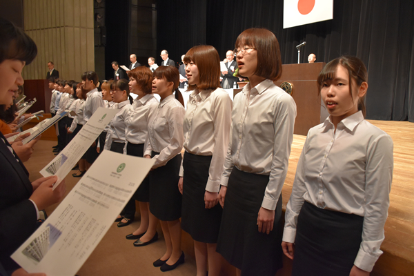 学生有志による校歌斉唱のあと、大友邦学長、三浦総一郎大学院長、高木邦格理事長の順に式辞を述べました。続いて、来賓を代表して成田市長の小泉一成様、千葉県健康福祉部 保健医療担当部長の岡田就将様から祝辞をいただくと、新入生529人は、この成田の地で世界を見据えた学びが始まることを肝に銘じていました。