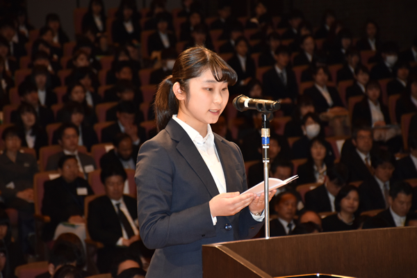 これを受けて、学部新入生を代表して、野原鈴香さん(言語聴覚学科=千葉県立成田国際高等学校出身)、金谷紗良さん(医学科=兵庫県 須磨学園高等学校出身)、ヘイン テッ アウンさん(医学科・留学生=ミャンマー出身)、大学院新入生を代表して、安谷屋仁さん(医学研究科 医学専攻 臨床医学研究分野)が「誓いのことば」を述べました。