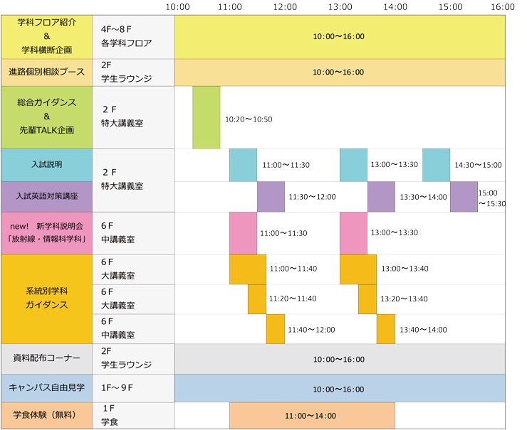 ![]() 学科フロア紹介&学科横断企画 ●体験/相談/模擬講義/先輩プレゼン/交流カフェetc. ●学科の連携がよくわかる学科横断シールラリー |