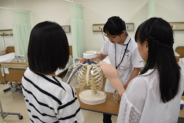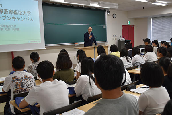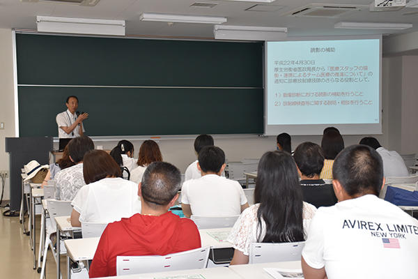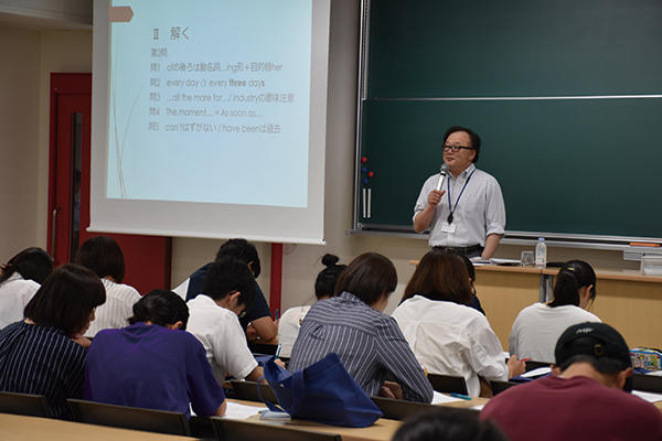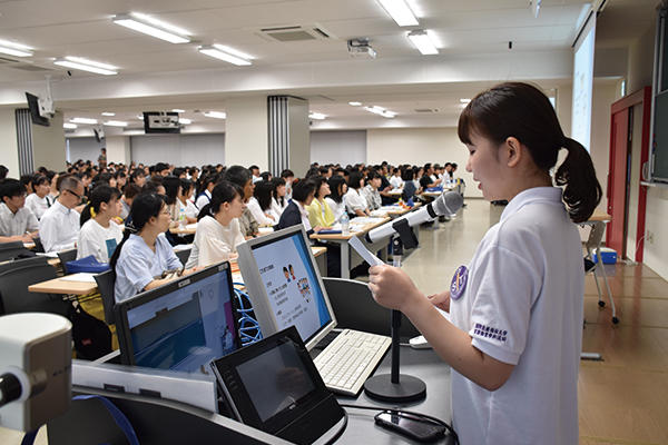 言語聴覚学科3年の女子学生による「キャンパスライフ紹介」では、言語聴覚士をめざしたきっかけや大学での勉強の様子を紹介するとともに、高校生活へのアドバイスもあり、うなずきながら聞く高校生や保護者の姿が見られました。「入試英語対策講座」では、教員が本学の英語の過去問を解説し、対策を伝授しました。来年4月に開設予定(設置届出書類提出中)の放射線・情報科学科の説明会では、学科長予定者によるガイダンスに加えて、大田原キャンパスの放射線・情報科学科がPR動画の放映とポスター展示を行い、診療放射線技師をめざす学修の一端を紹介しました。