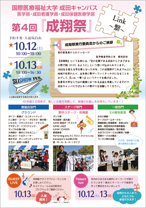 「成翔祭」という名称には「空の玄関である成田からさまざまな分野で翔(かけ)るように」という想いが込めれています。1800名を越える学生数となった今年、この成翔祭がこれまで以上に地域や世界の人々、出来事に繋がっていくきっかけになることをめざして、『Link ~繋~』というテーマを揚げました。