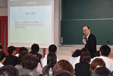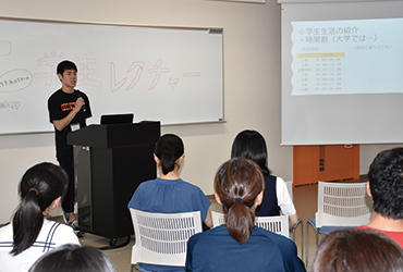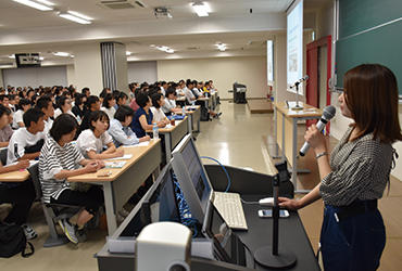 看護学科2年の女子学生による「キャンパスライフ紹介」では、看護師をめざしたきっかけやこれまでの勉強の様子だけでなく、3~4年次に行われる臨床実習の予定も織り交ぜて、看護師をめざす4年間の学びをわかりやすく紹介しました。