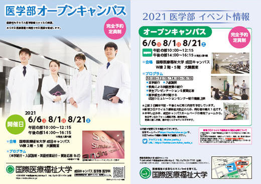 予約制 定員200名 (午前・午後入れ替え制) ※定員に達しましたので、お申し込みの受付を終了しました。 なお、8月のオープンキャンパスお申し込みは、6月中旬を予定しています。 開催日時 午前の部 10:00~12:15 プログラム(午前・午後共通) 6⽉26⽇(土)に東京赤坂キャンパスで医学部説明会を開催いたします。 今後の状況次第で内容を一部変更、もしくはWEB上での開催に変更する場合がございます。その際はメールにて連絡いたしますので、ドメイン指定受信で「@iuhw.ac.jp」が受信できるように設定してください。 新型コロナウイルス感染拡大の防止対策について オープンキャンパスに参加される際は、下記の注意事項をご確認のうえ、最大限の注意をはらい、可能な限り参加者ご自身で感染防止に努めていただきますようお願いします。 お問い合わせ