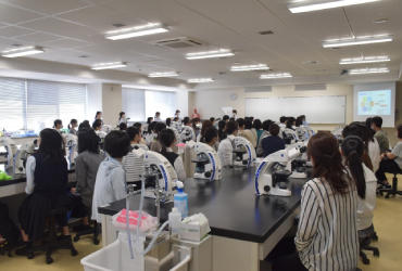 顕微鏡がならぶ医学検査学科の説明風景 -
