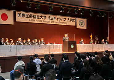 成田キャンパスの入学式が4月3日、春雨に煙る国際医療福祉大学成田病院の成田国際ホールで行われ、医学部、成田看護学部、成田保健医療学部、臨床工学特別専攻科、大学院の新入生計599名が入学しました。新型コロナウイルス感染症対策のため、前年に続き事前にPCR検査を実施し、出席者を学生と大学関係者に制限しての実施となりました。