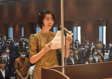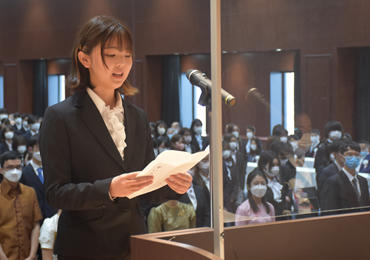 式典では、高木邦格理事長、鈴木康裕学長、三浦総一郎大学院長の式辞と、来賓の小泉一成成田市長の祝辞に続き、新入生代表4名が「誓いのことば」を述べました。