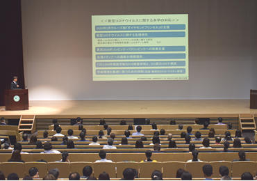 「この国の未来を担う皆さんへ」をテーマに講演した河村朗夫循環器内科学主任教授は、医師の働き方や給与の実情などについて、最近のニュースを取り上げながら解説しました。真剣な表情で耳を傾ける参加者に、「うちの学生は素晴らしいが、教員も素晴らしい。情熱にあふれ、教え好き。学生との距離が非常に近い」と熱い口調で訴えました。
