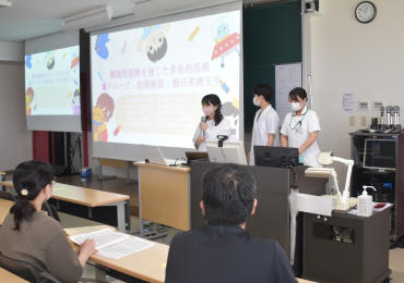 成田看護学部、成田保健医療学部でも、「先輩TALK」のコーナーに「多職種連携実習」で優秀賞を獲得した学内チームが参加し、医師のほかさまざまな医療職種が協働する臨床現場を想定した演習の経験を説明しました。「学部、学科の違うチームで、最初は緊張するものの、症例研究を経て、コミュニケーションの取り方や、職種の違いを学ぶことができる」という説明は、高校生や保護者の方々に医療福祉の総合大学である本学の特徴を肌感覚で伝える機会となったようです。