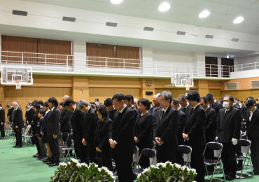 合同慰霊祭ではご遺族、教職員、学生など約250人の参加者全員で医学教育、研究のためにご献体された方々に黙とうを捧げた。続いて本学から追悼のことば(鈴木康裕学長)、お礼のことば(坂元亨宇医学部長)、感謝のことば(医学部3年生学生代表)を述べた。そして、参加者全員が一人ひとり祭壇に献花した。