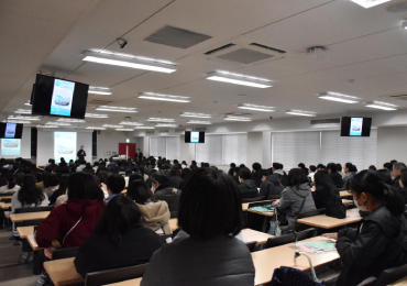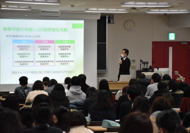 特大講義室にて本学の特長を説明 -