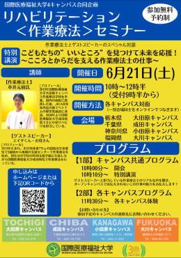 高校生および受験生を対象とした「リハビリテーション(作業療法)セミナー」を開催いたします。作業療法に興味をお持ちの方はぜひご参加ください。本セミナーは大田原・成田・小田原・大川の4キャンパスの作業療法学科の合同イベントです。参加会場をお選びいただきます。お申し込みの際は参加するキャンパスを選んでお申し込みください。