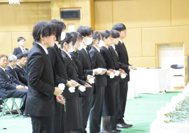 合同慰霊祭ではご遺族、教職員、学生など約300人の参加者全員で医学教育、研究のためにご献体された方々に黙とうを捧げた。続いて本学から追悼のことば(鈴木康裕学長)、お礼のことば(坂元亨宇医学部長)、感謝のことば(医学部3年生学生代表 五味田元さん)を述べた。そして、参加者全員が一人ひとり祭壇に献花した。