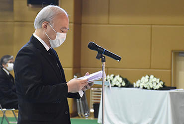 11月7日、成田キャンパスにおいて、ご遺族、教職員、学生の参列のもと、今年度の『解剖体慰霊祭並びにご遺骨返還式』が、新型コロナの感染対策を行ったうえで挙行されました。初めに参列者全員で、医学教育および研究のためにご献体された方々に黙祷を捧げました。次に、大友邦学長が追悼のことば、河上裕医学部長が御礼のことば、さらに、医学部生が学生を代表して感謝のことばを述べました。その後、参列者全員が祭壇に献花を行いました。引き続き、ご遺骨返還式を挙行し、河上医学部長からご遺族にご遺骨を返還しました。最後に、解剖学の小阪淳教授の挨拶により閉会となりました。